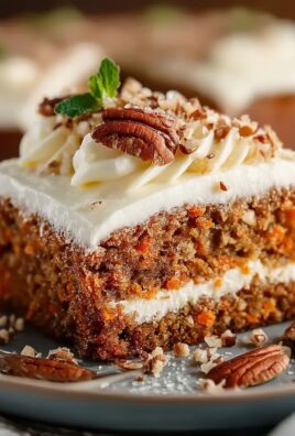 Dieser Karottenkuchen ist mehr als nur ein Backwerk. Er ist ein Fest für die Sinne, das durch seine unvergleichliche Saftigkeit, die harmonische Süße und das cremige Frischkäse-Topping mit seinen überraschenden Stückchen besticht. Jedes Mal, wenn ich ihn backe, entsteht eine regelrechte Warteschlange vor meiner Küchentür. Es ist die perfekte Kombination aus den erdigen Noten der Karotten, der Wärme der Gewürze und der Süße des Zuckers, die ihn so unwiderstehlich macht. Die Frischkäsestückchen im Topping sind das kleine Geheimnis, das ihn von anderen Rezepten abhebt und eine wunderbare Textur ins Spiel bringt, die man einfach lieben muss. Es ist das ideale Rezept, um Freunde und Familie zu beeindrucken oder sich selbst an einem regnerischen Nachmittag zu verwöhnen. Dieser Karottenkuchen mit Frischkäsestückchen – saftig, süß und cremig – ist ein wahrer Seelenschmeichler, der immer für gute Laune sorgt.