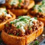 Rustikale Offene Knoblauchtoast-Sloppy-Joes: Herzhaftes Rinderhack in würziger Tomatensauce auf knusprigem Knoblauchtoast.